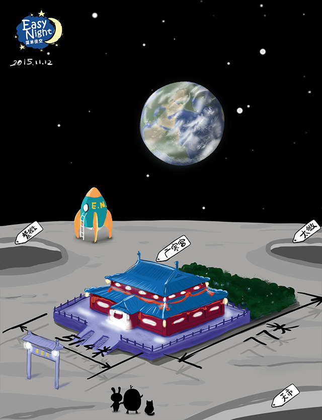 2016年的1月4日,国际天文学联合会(InternationalAstronomical Union,IAU)正式批准了中国提交的4个月面地理实体的命名方案。它们分别是“广寒宫”、“紫微”、“天市”和“太微”。其中,“广寒宫”是嫦娥三号的着陆地点,被定义为以纬度44.12 °为北界、纬度44.11 °为南界、经度-19.51 °为东界、-19.52 °为西界所围限的这么一片矩形区域;而“紫微”、“天市”和“太微”则是与“广寒宫”相邻最近的三个雨海陨击坑。