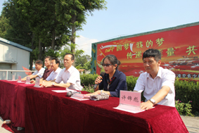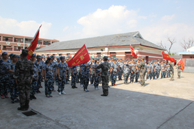 仪式在慷慨激昂的国歌声中拉开帷幕,首先由基地领导致欢迎词,对我校全体师生表示欢迎,并对学生提出了要求与希望。随后,来自16DKZG1,3班的学生代表邱安杰同学在发言中承诺:要勇敢迎接军训和中职生活的挑战,以军人的身份严格要求自己;服从教官的管理,保持良好的秩序,认真训练,努力完成规定的军训任务;向教官学习,学习他们的好思想、好作风、好品德,并在今后的学习、生活中发扬光大。接着基地教官带领全体学生进行入营宣誓并向各排授旗。