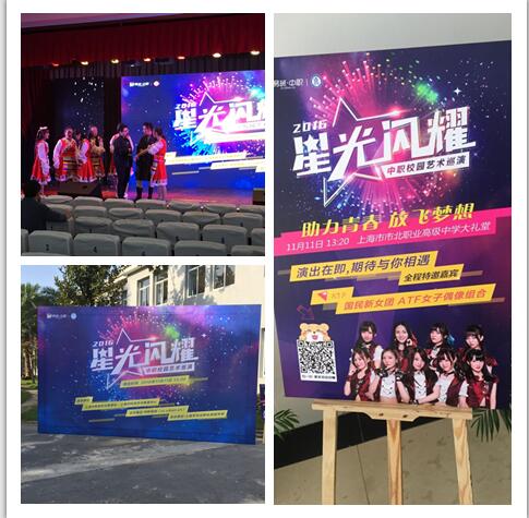 11月11日由上海市教委职教处、上海市科学艺术教育中心指导,中职易班主办的2016“星光闪耀”中职校园艺术巡演市北职高专场在我校正式起航。本届巡演主题为“助力青春、放飞梦想”,旨在为中职学生提供一个挑战自我、展现真我的舞台,加强校际间艺术交流,提高中职学生艺术修养。除了我校学生表演的啦啦操外,参与本次活动演出的还有来自上海健康医学院附属卫生学校和上海市商贸旅游学校的同学们,以及国民新女团ATF女子偶像组合作为全程特邀嘉宾,与我校学生交流互动,为此次巡演增色不少。今天的巡演除了欣赏演出、交流才艺外,同学们扫描节目单下方的二维码,登录中职易班为自己最喜欢的节目投票,并选出本届巡演的“闪耀之星”。此次活动不仅展现我校学生的艺术风采,而且引领学生在更广的舞台放飞青春的梦想。