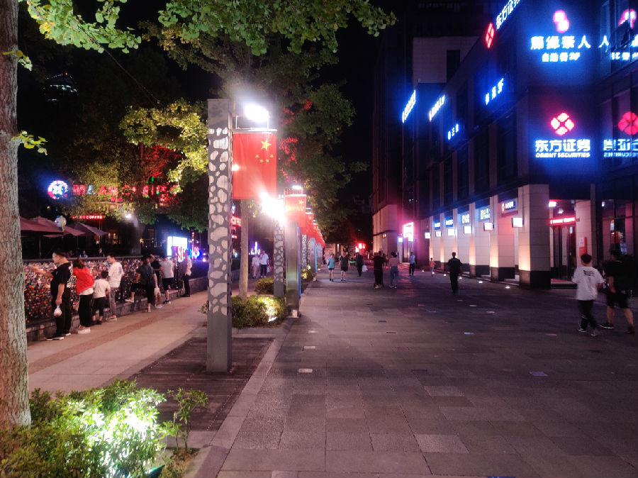这张图是在国庆第一天12:00拍摄的,举国同庆,而在这天也有很多商家经营到很晚,所以即使到了12点依然灯火通明,而因国庆也有很多人出来散步,有的停下来一个人低头处理工作,有一家人出来的,也有一些青少年玩滑轮,所以想突出在国庆,城市中的瞬息万变,而抓拍滑轮滑过的这个镜头呢,则是想让这个动景与后面的静景突出对比,路中央有红旗,而我选择冷色调的光源与其形成一种色彩对比,也是想表达出一种城市魅力。