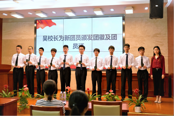 团委书记王韧冰老师宣布新团员入团仪式正式开始。首先,全体起立,奏唱国歌。接下来,王韧冰老师宣读新团员名单,在被叫到名字的新团员脸上都洋溢着无比自豪的笑容。吴校长亲自为新团员代表佩戴团徽。团徽不是一个装饰品,而是共青团员肩负责任的标志。每个团员从佩戴上团徽这一刻起,就要认清自己肩负的责任,努力履行团员义务,用实际行动来证明自己无愧于共青团员这个光荣的称号。