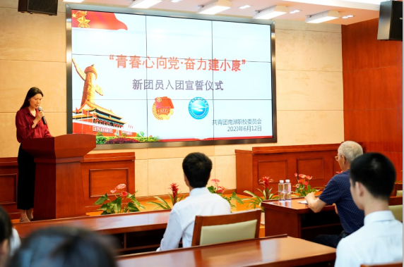 2020年6月12日下午2:10在文化楼一楼会议室隆重举行了上海南湖职校2019学年第二学期新团员入团宣誓仪式。参加本次活动的有关工委领导、前德育分管副校长吴校长,德育处主任达老师、团委书记王韧冰、30名来自各个班级的新团员,以及老团员和群众青年代表。