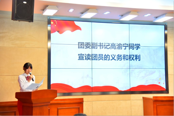 随后,由王韧冰老师带领新团员宣誓,面对着鲜红的团旗,每个新团员庄严宣誓,相信这一天将会是他们最难忘的一天,牢记自己作为共青团员的荣誉感和责任感。宣誓完毕,团委副书记高渝宁同学宣读《团章》中规定的团员义务和权力。