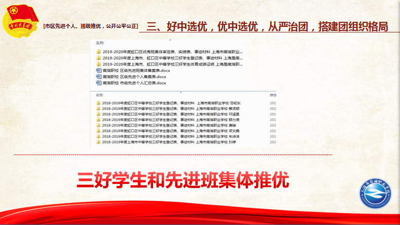 每年团委都组织开展上海市、虹口区三好学生和先进班集体推优工作,团委严格按照文件要求落实,做好民主推荐过程性记录,对申报的个人和集体进行严格把关。