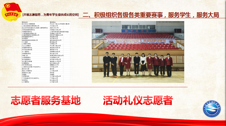 我校目前设有32个志愿者服务基地,4个志愿者服务项目。除了各班前往进行志愿者服务以外,团委还开设有虹口区出入境管理局、鲁迅纪念馆、中共四大纪念馆、海派文化中心等大型志愿服务项目,而每年的校园开放日、职业体验日、世界大赛团委都会组织志愿者前往参与。