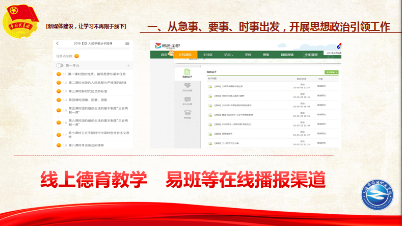 中职易班,一直都是团委开展思想政治引领工作的一个重要阵地。每周的易班主题帖,涉及时事、节日、学校活动等方方面面,青年学生能够通过易班平台了解更多学校情况。同时今年由于新冠疫情,团委将“开学第一课”“团前教育”内容搬到线上学习通平台,也第一次尝试了系列课程,通过“防疫科普”“心理健康”“卫生保健”“生命教育”四个主题完成学生线上教学的过渡。