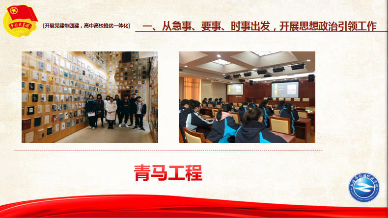 自2017年以来,我校共开展三届“青年马克思主义者培养工程”,在校内开展中学生党章理论学习班,从各班遴选品学皆优的团员青年参与,每一届历时半年,在三届学习班中,共推荐九位优秀学员参与区级青马工程学习,其中四人已顺利结班,并顺利进入高校。