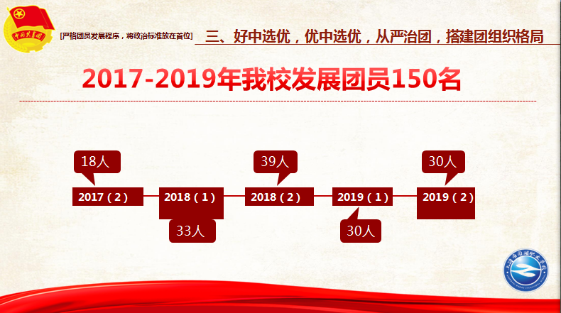 2017年至2019年,我校遵循团区委要求,共发展团员150名。发展过程严格,严控团员发展比例,谨遵入团十步曲,有据可查,坚持不破格,不放松。