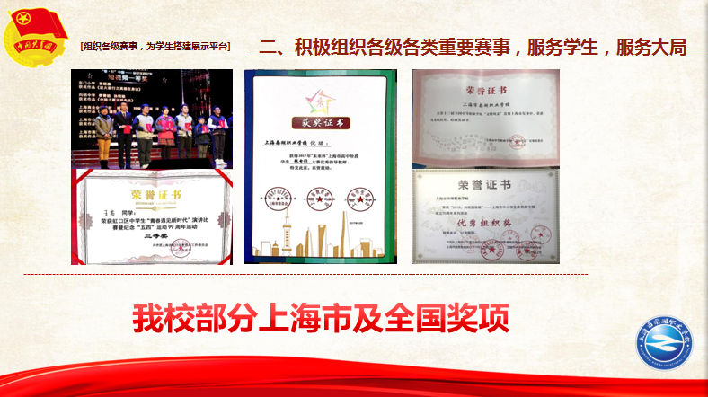 2017至2018年,我校团委参与上海市“五四红旗团委”评比,经过一年的征选,开展各级活动、撰写共青团课题,与江湾镇街道共建,我校于2018年年初荣获上海市五四红旗团委的称号。