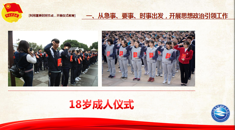 自2017年以来,我校分别于校内、校外等红色基地组织开展了6次新团员入团宣誓仪式,而每年的“一二九爱国主义运动”前后,团委组织在校三年级青年前往龙华烈士陵园、吴淞炮台和陈云纪念馆开展隆重的“十八岁成人仪式”,以宪法彰显青年学生的成人以及他们将肩负起的社会责任。