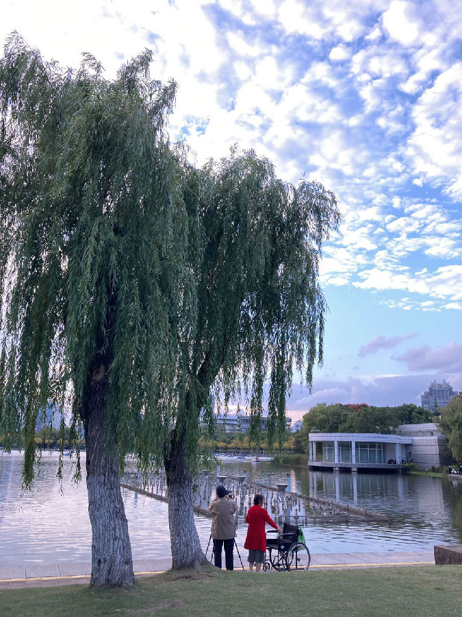 20. 《垂柳下的他们》今年是新中国成立71周年,也许是天公知道了这是我们祖国母亲的生日,晴空万里。乘着初秋的好天气我来到了世纪公园和我的朋友们一同野餐。没曾想在我肆意的镜头中捕捉到了这样温馨的一幕:顺着湖边的垂柳向下望,一对老夫妇出现在眼前,奶奶穿着一件喜气洋洋的红色大衣扶着轮椅,爷爷则在一旁撑起了三脚架架上了相机多半是想记录下这美好的一刻。我相信爷爷奶奶也想不到记录美好瞬间的同时成为了我镜头里的那一瞬间。