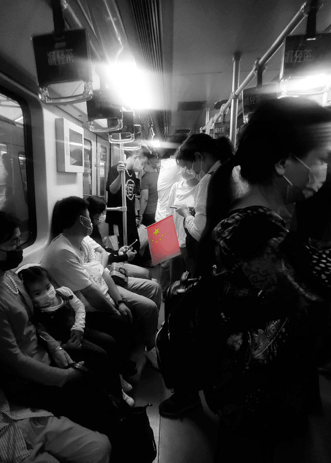 42《那一抹红色》这张照片是在地铁中拍摄的,照片经过后期微调,想体现的是国庆假期人们庆祝国庆的方式,地铁中拿着小红旗为国欢庆,使用黑白作为底色是为了突出国旗,用到的是对角线的摄影构图方法。