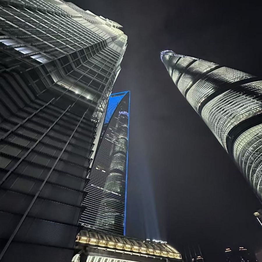 我选择从地面向上仰望的拍摄角度,这样不仅使得建筑物显得更加雄伟壮观,同时也展现了我独特的视角和技巧。这样的夜景不仅展示了上海作为国际大都市的魅力,也体现了中国现代建筑的创新与成就。