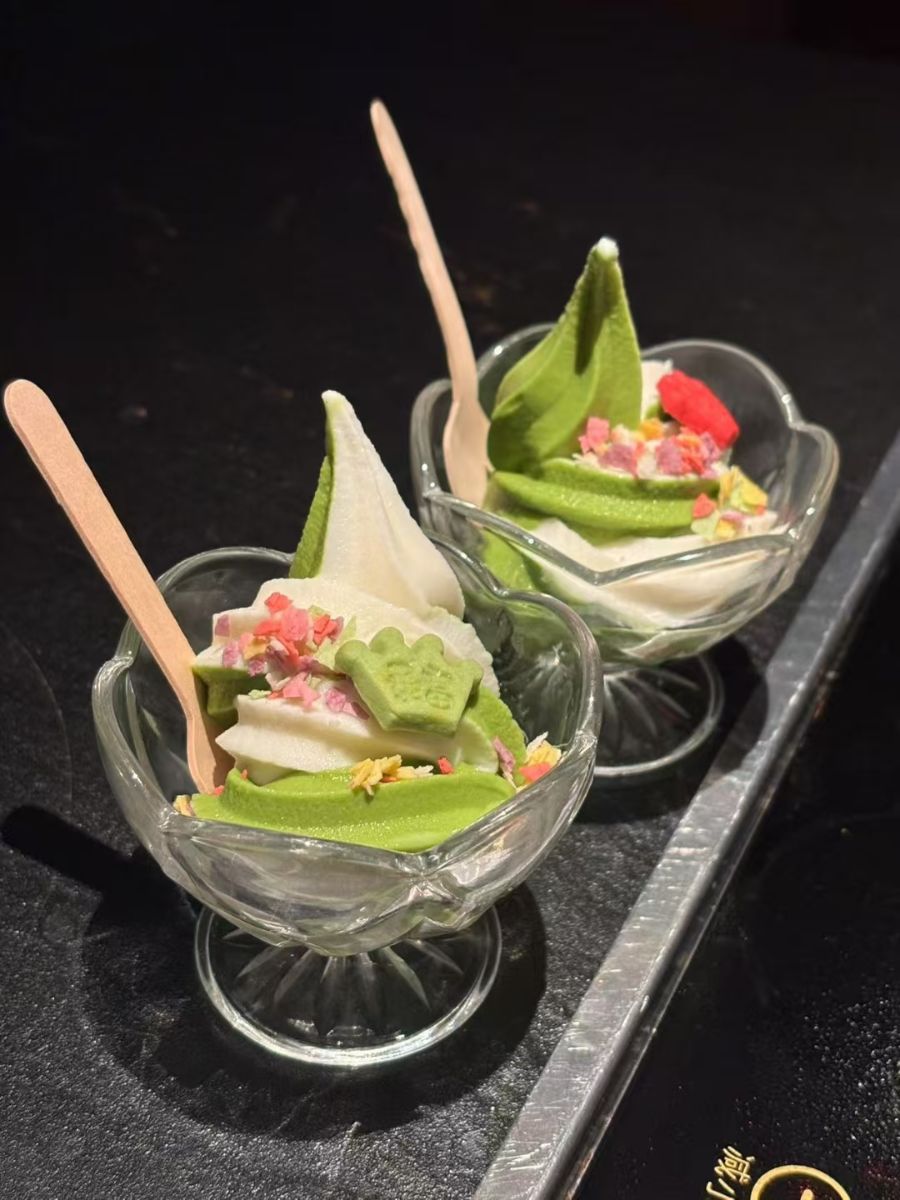 用木勺轻轻挖起一勺送入口中,抹茶的微苦与奶香的醇厚瞬间在味蕾间绽放,丝滑的口感仿佛在舌尖舞蹈,每一口都诉说着春日的美好与惬意,让人沉醉在这一抹清新的甜意之中。