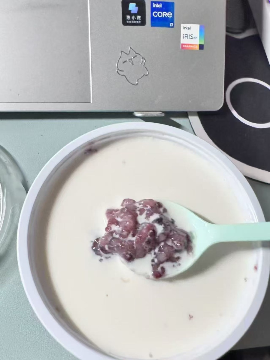 舀起一勺,紫米软糯饱满,裹着丝滑牛乳,送入嘴中,奶香与米香缠缠绕绕。身旁笔记本电脑静静待着,机身贴的小贴纸添了几分俏皮。