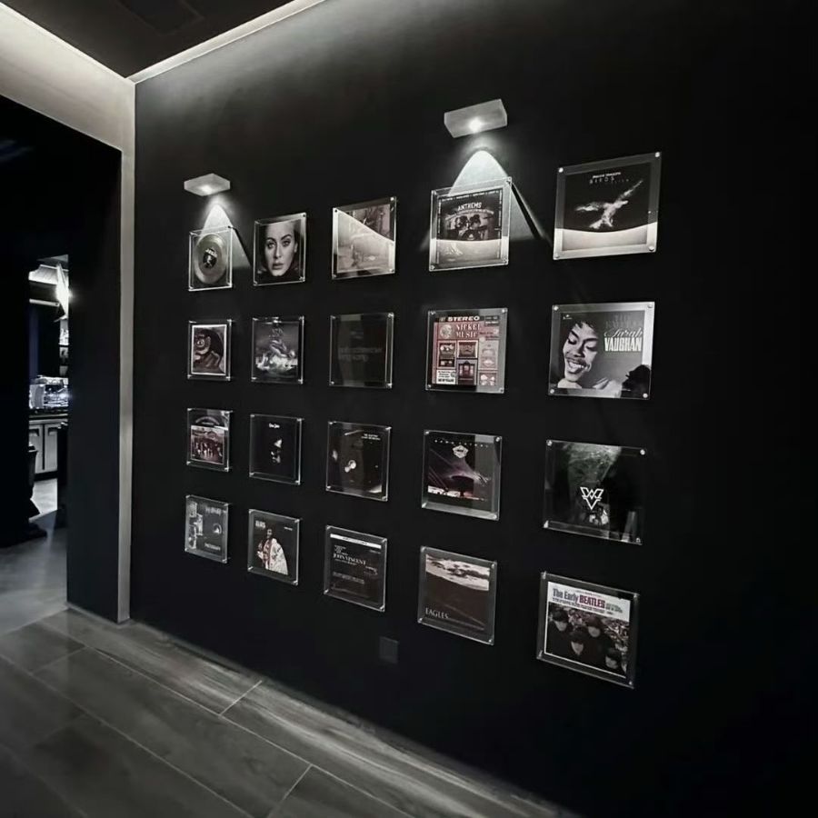 这面黑色墙面上的唱片陈列,像一帧帧凝固的音乐记忆,在射灯的晕染下泛着旧时光的光泽。透明亚克力框里,从披头士的《The Early Beatles》到老鹰乐队的经典封面,从黑白人像的爵士唱片到带着复古“STEREO”标识的老专辑,每一张都裹着不同年代的旋律——或许是60年代摇滚的躁动,或许是70年代蓝调的慵懒,或许是某个小众歌手被珍藏的私语。