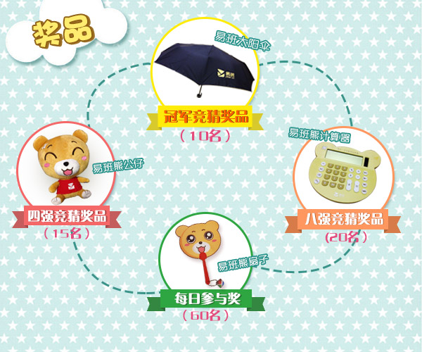 参与三场世界杯竞猜活动,即有可能获得易班阳伞、易班熊公仔和易班熊计算器!每日还特设2名幸运参与奖,获得易班熊扇子!