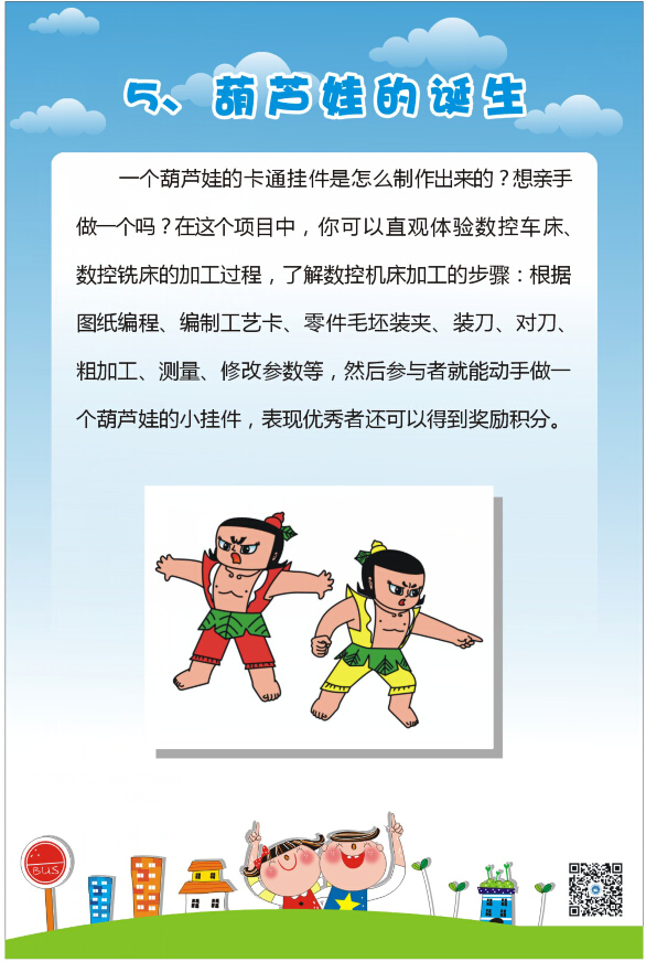 你想知道一个金属笔筒是怎么制作出来的?想亲手做一个吗?在这个项目中,你可以直观体验数控车床、数控铣床的加工过程,了解数控机床加工的步骤:根据图纸编程、编制工艺卡、零件毛坯装夹、装刀、对刀、粗加工、测量、修改参数等。然后参与者就能动手做一个存放文具的金属笔筒。