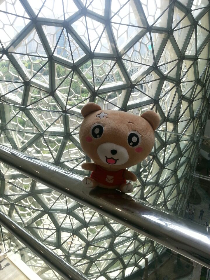 螺旋上升的绿色屋面从一池清水中“冉冉升起”,形色各异的石块雕塑环绕着主馆,“原始森林”拔地而起,人造瀑布倾泄而下。怎能辜负如此美景?易班工作站成员们在此合影留念。